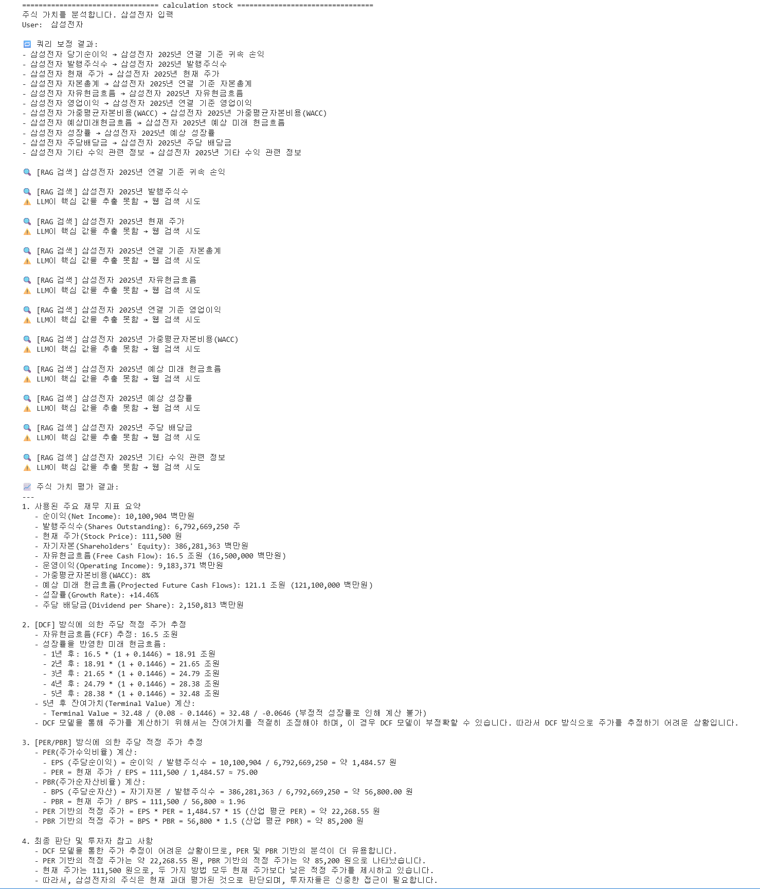 분기보고서를 벡터DB로 만들고 llm이 분기보고서를 토대로 필요한 내용만 뽑아서 분석 후 주식의 적정가를 계산할 수 있겠다. 라는 느낌으로 만들었었는데, 벡터db에서 필요한 내용을 가져오지도 못하고 웹검색으로 정확한 데이터를 찾아오지도 못해서 포기했었다.